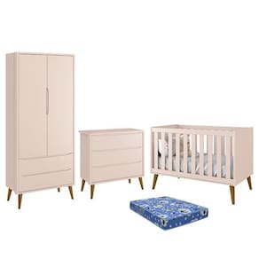 Dormitório Infantil Theo Retrô 2 Portas, Cômoda, Berço com Pés Amadeirado e Colchão - Reller Móveis - Rosa