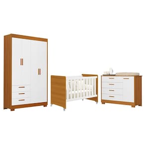 O conjunto perfeito para organizar e compor o quarto do bebê com segurança, praticidade e estilo. O Guarda Roupa Zaki possui 4 portas, 3 gavetas com corrediças telescópicas, cabideiro metálico e pés em PVC, oferecendo amplo espaço interno e estrutura resistente em MDF com pintura UV atóxica. A Cômoda Zaki vem com 1 porta e 4 gavetas, sistema antitombamento, puxadores em MDF e pés em PVC, garantindo funcionalidade e segurança no dia a dia. O Berço Evolution 4 em 1 pode ser utilizado como mini berço, berço, sofá-cama e mini cama. Com 3 regulagens de altura do estrado, rodízios em gel (2 com trava) e certificação INMETRO, é versátil e seguro para acompanhar o crescimento da criança.