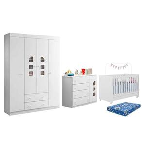 Dimensões: Tamanho do Guarda-Roupa (L x A x P): 147 x 203 x 45 cm Tamanho da Cômoda (L x A x P): 105 x 92 x 45 cm Tamanho do Berço (L x A x P): 132,6 x 91,6 x 77 cm Tamanho do Colchão (L x A x P): 70 x 10 x 130 cm