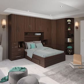 * Colchão e itens de decoração não estão inclusos. Imagens meramente ilustrativas. Dormitório de casal com cama embutida, versão mais completa. A cama de casal com baú além de muito resistente e confortável também agrega mais espaço com suas 4 gavetas, duas de cada lado. O dormitório é na verdade um conjunto de módulos. Você pode mudar a composição trocando ou adicionando módulos conforme seu gosto e seu espaço. – 02 Guarda-roupas de 2 portas e 5 gavetas com mesa de cabeceira embutida modelo 1224; – 01 Maleiro de casal Queen Size 4 portas modelo 1226; – 01 Armário de Canto Sextavado modelo 1231; – 01 Guarda-roupa de 2 portas e 3 gavetas modelo 1228; – 01 Cantoneira com 6 prateleiras curvas modelo 1322; – 01 Cama de Casal Queen Size para colchão 158×198 cm com Baú e 4 gavetas modelo 1251; DIMENSÕES DO PRODUTO MONTADO - ALTURA 240 CM; - LARGURA 390 CM; - PROFUNDIDADE 51CM NOS ARMÁRIOS E 230CM NA CAMA Vão livre de 166cm de comprimento por 110cm de altura abaixo do maleiro. Para compras de dormitórios sem a cama inclusa lembre-se sempre de verificar se a cabeceira da sua cama cabe neste espaço Atenção: Não nos responsabilizamos, no ato da entrega, por desmontagens, subir escadas/elevadores ou transporte por guincho para apartamentos. Eventuais despesas são de responsabilidade do cliente. Confira as dimensões deste produto e certifique-se de que o mesmo passará normalmente por supostos elevadores, portas, escadas e/ou corredores de sua moradia.