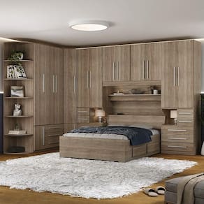 Dormitório Queen Size Sem Cama 1222s Castanho * Colchão e itens de decoração não estão inclusos. Imagens meramente ilustrativas. Dormitório de casal Queen Size para embutir a cama (cama não inclusa). O dormitório é na verdade um conjunto de módulos. Você pode mudar a composição trocando ou adicionando módulos conforme seu gosto e seu espaço. 02 Guarda-roupas de 2 portas e 5 gavetas com mesa de cabeceira embutida modelo 1224; 01 Maleiro queen size 4 portas modelo 1226; 01 Armário de Canto Sextavado modelo 1231; 01 Guarda-roupa de 4 portas e 3 gavetas modelo 1249; 01 Cantoneira com 6 prateleiras curvas modelo 1322; Puxadores 256mm. DIMENSÕES DO PRODUTO MONTADO - ALTURA 240 CM; - LARGURA 390 CM; - PROFUNDIDADE 51CM NOS ARMÁRIOS. Vão livre de 166cm de comprimento por 110cm de altura abaixo do maleiro. Para compras de dormitórios sem a cama inclusa lembre-se sempre de verificar se a cabeceira da sua cama cabe neste espaço. Atenção: Não nos responsabilizamos, no ato da entrega, por desmontagens, subir escadas/elevadores ou transporte por guincho para apartamentos. Eventuais despesas são de responsabilidade do cliente. Confira as dimensões deste produto e certifique-se de que o mesmo passará normalmente por supostos elevadores, portas, escadas e/ou corredores de sua moradia.