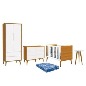 Dormitório Theo 2 Portas, Cômoda 6 Gavetas, Berço, Mesa de Canto com Pés Amadeirado e Colchão - Reller Móveis