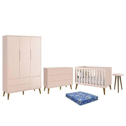 Dormitório Theo 3 Portas, Cômoda 6 Gavetas, Berço, Mesa de Canto com Pés Amadeirado e Colchão - Reller Móveis O Dormitório Completo Infantil Theo é baseado no estilo retrô, traz consigo conceitos de elegância, charme e modernidade. Conta com um belíssimo Guarda-Roupa com excelentes repartições internas para roupinhas ficarem sempre organizadas. A Cômoda 6 gavetas é um ótimo auxilio para o guarda-roupa, oferece espaço para roupas dobráveis e pequenos acessórios. O Berço se transforma em uma charmosa mini cama, acompanhando o desenvolvimento do seu filho e auxiliando na transição do berço para caminha. A Mesa de Apoio vai deixar o ambiente mais completo e funcional. E para completar, o Colchão Baby Physical da Ortobom vai proporcionar o conforto que seu filho merece na hora do soninho.
