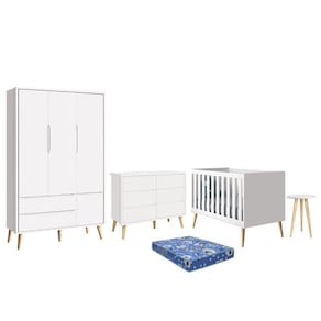Dormitório Theo 3 Portas, Cômoda 6 Gavetas, Berço, Mesa de Canto com Pés Madeira Natural e Colchão - Reller Móveis - Branco