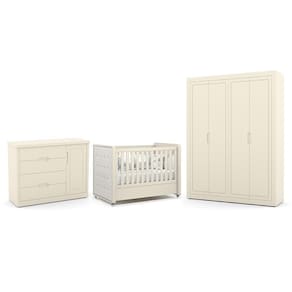 O Dormitório Tutto New é composto por um guarda-roupa, uma cômoda e um berço com capitonê, oferecendo elegância e funcionalidade. O guarda-roupa possui 4 portas com puxadores usinados, 4 gavetas internas, cabideiros em alumínio e amplo espaço interno. A cômoda conta com 1 porta, 4 gavetas, cabideiro em alumínio e corrediças telescópicas, garantindo praticidade no dia a dia. O berço, certificado pelo INMETRO, tem estrutura em MDF, 3 regulagens de altura no estrado, rodízios com trava e pode ser transformado em mini cama. O toque de sofisticação fica por conta do capitonê em bouclê com espuma antichama.