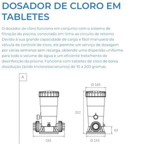 O dosador de cloro funciona em conjunto com o sistema de filtração da piscina, conectado em linha ao circuito de retorno. Devido à sua grande capacidade de carga e fácil manuseio da válvula de controle de cloro, ele permite um serviço de dosagem por várias semanas sem recarga, obtendo uma dispersão uniforme para todo o volume de água e um eficiente tratamento de desinfecção da piscina. Funciona com tabletes de cloro de baixa dissolução ácido tricloroisocianúrico de 10 a 200 gramas.