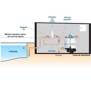 Este acessório deve ser instalado na tubulação de retorno da piscina, após o filtro e o aquecedor, (se houver). Sempre que possível é recomendável que se instale o dosador acima do nível da água da piscina.