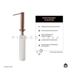 É um produto que combina perfeitamente com os outros utensílios da cozinha além de ocupar pouco espaço na bancada. Quando acionado, libera a quantidade ideal de detergente ou sabão para uso, evitando o desperdício.