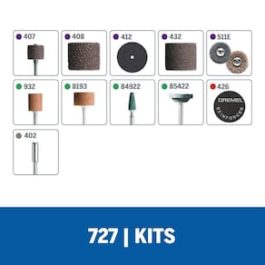 O Kit Dremel 727 de 31 peças é o kit ideal para quem quer cortar, esmerilhar, gravar e lixar madeira, PVC, metal, pedra, vidro com as micro retíficas Dremel. Ele conta com 10 modelos de acessórios diferentes. O estojo plástico com tampa transparente e bandeja removível permite armazenar e organizar os acessórios além disso ele pode ficar em pé ou pendurado na parede com um gancho. O kit consiste em pedras de esmerilhar de óxido de alumínio, pedras de esmerilhar de carbeto de silício, disco de corte reforçado com fibra de vidro, discos de lixa, tubo de lixa, discos abrasivos de grão grosso para polimento, ponta para gravar e esmerilhar, EZ Lock e mandril. O sistema de troca rápida e fácil de acessórios EZ Lock tm é patenteado e faz com que a troca seja 6 vezes mais rápida do que usar um mandril convencional.