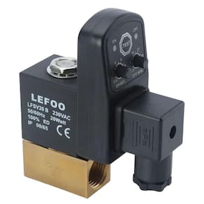 Dreno Purgador Eletrônico Com Registro e Filtro Normalmente utilizado em Reservatórios de de Ar Comprimido para Drenar o Condensado que fica no Tanque.Este produto tem a função de Abrir e Fechar a válvula conforme regulado no temporizador.O dreno de tempo e tempo de intervalo são ajustáveis.Com este produto você dispensa a necessidade de ter alguém responsável por executar esta tarefa simples e muito importante. Especificações TécnicasRosca Solenóide: 1/2" - Entrada / Saída Rosca Registro Filtro Y: 1/2" - Entrada / SaídaVoltagem: 220v/1/60HzTempo de Abertura da Descarga: 0.5 A 10 SegCiclo de Acionamento: 0.5 A 45 MinutosPressão Máxima: 16 BarTimer: Analógico com Botão de TesteDiâmetro do Orificio Interno: 3 mmCompatível com: ÁguaTemperatura Máxima: -20 ~ 80°C Referência de FábricaLFSV20-B