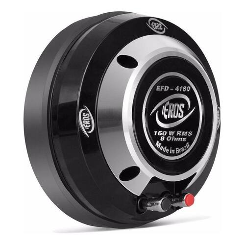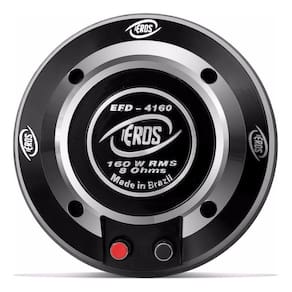 O Driver Eros EFD-4160 - 160 Watts RMS, possui diafragma Fenólico e bobina de Kapton com sensibilidade de 110Db, o que é próprio para uso em competições. Produto de alto rendimento, atinge 320w de capacidade musical, o que potencializa as frequências médias e deixa o som muito mais forte. Especificações Técnicas: • Resposta de frequência: 300 a 9.000Khz• Impedância nominal: 8 ohms• Potência RMS: 160 watts• Potência musical: 320 watts• Sensibilidade (1w/1m): 110Db SPL• Crossover recomendado: 500 hz - 12 db / oitava• Diâmetro da garganta: 50 mm• Diâmetro da bobina: 100 mm• Material do diafragma: Resina fenólica• Fio da bobina: Alumínio (CCAW seção chata)• Material da forma da bobina: Kapton• Material do ferrite: Bário Conteúdo da Embalagem: • 01 Driver Corneta Eros EFD-4160 Fenólico 160W RMS 8 ohms• Manual e Certificado de Garantia Importante:• Garantia de 273 dias.