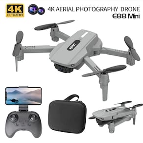 Drone E88 Mini RC,Câmera 4K Fotos e Video, Aplicativo Wifi Cor: cinza Drone com câmera HD, modo estável, drone fácil de controlar, e pequeno para entrar em qualquer local e fácil brincar ou explorar 1 camera 4k hd, pode ser ajustada manualmente 45 graus. 2 quality qualidade de imagem: altitude hold pela pressão do ar, pairar de forma estável no ar: tiro anti-agitação, fácil e simples de operar para novatos, bloqueio de posição precisa, efetivamente impedindo câmera e tela de vídeo jitter, qualidade de imagem clara, fácil em qualquer ângulo. 3 controles do telefone móvel: baixe o aplicativo, conecte à aeronave através do wifi, você pode controlar a aeronave através do telefone celular, com funções mais abrangentes e operação relativamente fácil. 4 transmissão de imagem em tempo real: o backhaul de alta definição de wifi adota a tecnologia avançada de transmissão de imagem em tempo real, e a imagem de transmissão é suave e clara. Não só mostra busca da vida, mas também exploração à distância 5 produção de música mv: função de produção poderosa para embelezar o vídeo e adicionar música. Facilmente fazer vídeos curtos de blockbusters, não só para gravar a vida, mas também criar blockbusters durante a viagem Recorde, melhor do que visto