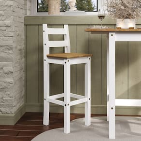 - Acabamento: Cera cor branco lavado com veios e nós aparentes | Assentos: Cera cor marrom antique.