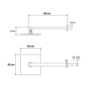 Especificações técnicas do produto e garantia. Marca: alpha hidrometais Cor: cromado Forma: quadrada Acabamento: polido brilhante Material ducha: aço inoxidável 201 Material tubo (cano): latão cobreado Modelo: ducha chuveiro quadrado Medidas ducha: 20 x 20 centímetros Medidas braço (cano): 40 centímetros Pressão mínima: 3 m.C.A. (coluna de queda de água) Bitola de conexão: 1/2 polegada com adaptador de 3/4 em metal Articulável: dispositivo que permiti ajustar ela na inclinação desejada.