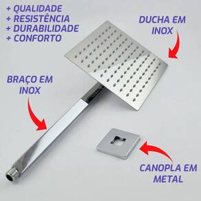 Uma nova experiência de banho. ducha Slim de 20x20 Cm Para Aquecedor Solar ou Gás.- O formato do chuveiro Quadrado leva ao ambiente sofisticação, além da experiência de um banho incomparável.- Possui crivos salientes, que facilitam a limpeza.- Jato linear, com fluxo contínuo. Perfeito para um banho com maior conforto.- Possui tela de proteção contra impurezas compostas na água, evitando com que o chuveiro seja danificado ou entupido por detritos.- Cabeça da ducha articulada, possibilita a escolha do melhor ângulo para um banho confortável.DADOS IMPORTANTESBitola de entrada de água: 1/2 - DN15;Vazão na pressão min em L/min: 12;Vazão na pressão máx em L/max: 40;Pressão mín funcionamento mca: 2;Pressão max funcionamento mca: 40;Tipo de Jato: Jato Linear;Composição Básica: Liga de Cobre bronze e latão ,Plásticos de Engenharia,Elastômeros;Garantia: 3 Meses;Fabricante: Dazie Metais; Marca: Dazie Metais