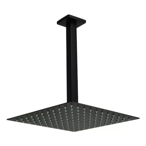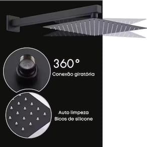 Ducha articulável em metal medindo 20X20 e braço de chuveiro de teto quadrado de 16,8cm Acabamento preto fosco (black matte) de alta durabilidade, resistência e livre de ferrugem;