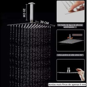 Informações Técnica Ducha: - Largura: 30 cm. - Comprimento: 30 cm. - Espessura da borda: 5 mm. - Modelo: Quadrado. - Aquecimento: A gás ou solar. - Aquecedor Compatível: Aquecedor a Gás, Elétrico ou Solar. - Articulável: Dispositivo que permite ajustar ela na inclinação desejada. - Conexão: 1/2 Padrão. - Acabamento: Acabamento arredondado para evitar lesões. - Vazão: 15 L/min por 10 m.C.A. - Polegada: 8 polegadas - Material: Inox 201 - Pressão mínima: 4 m.C.A. - Pressão máxima: 32 m.C.A. - Cor: Cromado - Peso: 1,130 kg - Material: Latão Inox e Cobre .