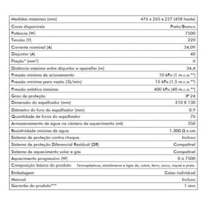 Ducha Eletrônica Ducali 7500W 220V Zagonel Ducali é a primeira ducha com design diferenciado da Zagonel. Com espalhador maior, fácil instalação, somando design e tecnologia, garante o melhor banho para vocêA ducha Ducali, é uma mistura de pura tecnologia, eficiência e design inovador, que se torna em no resultado de um chuveiro, que vai proporcionar uma experiência única, de banho com um grande espalhador, que cobre todo o corpo e uma excelente vazão de água, sistema microprocessado de ajustes de temperatura progressiva que fornece a temperatura ideal, garantindo o conforto e a prática que você merece Indicativo de Temperatura em LED Tecnologia Microprocessada Ótima Vazão Jato Obediente Compatível com sistema de Proteção Diferencial Residual Sistema de Proteção Contra Choque Compatível com sistema de Aquecimento Solar e Gás Acionamento com Baixa Pressão de água CARACTERÍSTICAS Marca: zagonel Modelo: ducali Cor: branca Potência: 7500w Pressão Mínima de acionamento: 10 kPa (1 m.C.A.) Pressão Mínima para vazão (3L/min): 15 kPa (1,5 m.C.A.) Pressão Estática Máxima: 400 kPa (40 m.C.A.) Aquecimento Progressivo: 0 à 7500W Grau de Proteção: IP 24 Armazenamento de água na câmara de aquecimento: 350 ml Tensão: 220v Corrente Nominal: 34.09 A Disjuntor: 40 A Fiação: 6 mm² Peso: 2 kg Dimensões (L x A x P): 26,5 x 23,7 x 47,6 cm