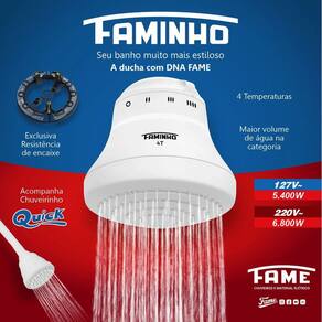 A troca de temperatura é feita com a ducha ligada, de forma segura e rápida. Seu design compacto facilita a instalação e combina com qualquer ambiente. Produzida pela Fame, marca referência no mercado nacional, a Faminho 4T une durabilidade, economia e praticidade.