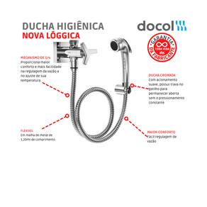 Qualidade da nossa marca para diversos ambientes. A ducha higiênica com registro e derivação Nova Lóggica possui os mesmos traços e detalhes de todos os outros produtos da linha, por isso pode ser um ótimo complemento ao seu banheiro ou lavabo. O funcionamento é perfeito tanto para ambientes com baixa e alta pressão. A ducha suporta temperaturas de até 70C e encaixa em bitolas ".INFORMAÇÕES TÉCNICASMarca: DocolLinha: Nova LóggicaCor: CromadoAcabamento: PolidoMaterial: Cerâmica, Elastômeros, Ligas de cobre, Plástico de engenharia, Zamac (ligas de zinco - alumínio - magnésio e cobre)Bitola: 1/2" - DN 15Tipo de Instalação: ParedeTemperatura Máxima do Líquido: 70CIndicação de Uso: BanheiroPressão mínima funcionamento mca: 2Pressão máxima funcionamento mca: 40Altura (cm): 18,9Largura (cm): 5,9Comprimento (cm): 9,6Garantia: toda vidaINFORMAÇÕES COMPLEMENTARES- Acabamento mais duradouro: Acabamento cromado biníquel de alta durabilidade e maior resistência à corrosão. Conserva a beleza e o brilho do produto por muito mais tempo.- Garantia Toda Vida: A primeira marca de metais sanitários brasileira a assegurar GARANTIA TODA VIDA para os produtos instalados em residências.- Sistema de abertura: 1/4 Volta, Linear- Tecnologias: 1/4 de volta, Acabamento biníquel, Cartucho com vedação cerâmica, Garantia Toda Vida- Conteúdo da embalagem: 1 Corpo, 1 Flexivel, 1 Canopla,1 O-ring, 1 Suporte, 2 Parafusos e 2 Buchas, 1 Restritor de Fluxo, 1 Ducha Manual- Acionamento: Alavanca, GatilhoSOBRE A FABRICANTEA Docol fabrica produtos bonitos e pensados para cada espaço e utilização, reconhecidos e premiados por diversas instituições importantes ao redor do mundo. Já são mais de 40 prêmios nacionais e internacionais.