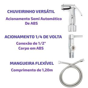 Acionamento com apenas 1/4 de volta, maior controle sobre o consumo da água; Gatilho de acionamento inteligente, fácil de acionar; Conexão de 1/2, padrão na maioria dos locais; Super leve e resistente, não enferruja e não mancha; Tamanho minimalista, se adapta ao design do banheiro; Mangueira de 1,2 Metros, tamanho ideal, sem excesso para ficar enrolando;