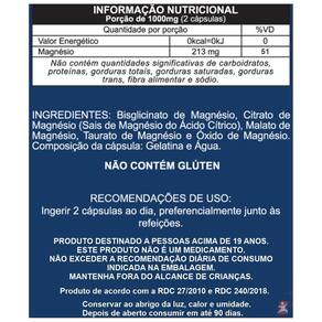 Benefícios - 213mg por porção do blend exclusivo de magnésios; - apenas 2 cápsulas ao dia; - metabolismo energético, proteínas, carboidratos e gorduras; - funcionamento neuromuscular e muscular; - auxilia no combate das dores no corpo e nas articulações e câimbras; - auxilia no transporte de cálcio para ossos; - excelente na luta contra as dores fibromialgia; - auxilia no combate dores de cabeça e enxaqueca; - melhorar o desempenho físico, porque é importante para a contração muscular. - não contém glúte, açúcares e lactose; - não testado em animais; - embalagem reciclável.