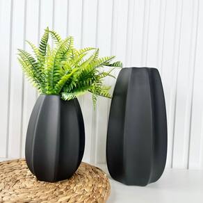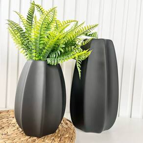 Decoração sala rack aparador dupla vaso centro de mesa grande e médio de cerâmica moderno trabalhado alto relevo na cor preto fosco decoração luxo com planta artificial.