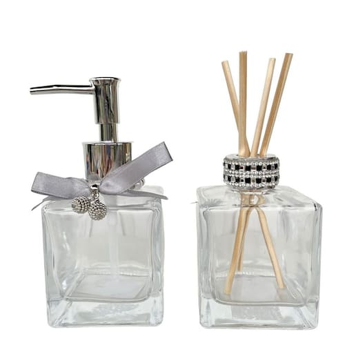 Decoração banheiro lavabo dupla difusor de vidro e porta sabonete líquido preto/ transparente trabalhado com varetas e detalhe pedrarias.