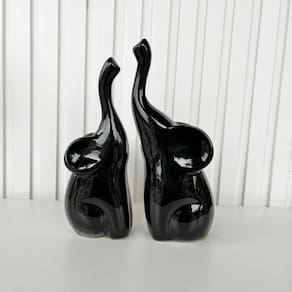 Decoração rack estante dupla escultura estátua animal elefante preto grande/pequeno mãe e filho com tromba para cima de cerâmica enfeite para sala.