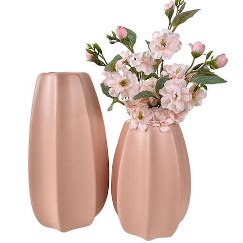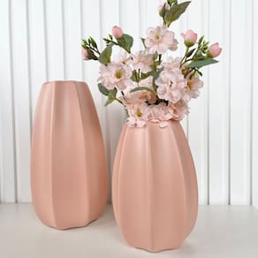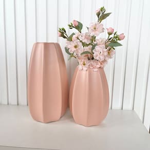 Decoração sala rack aparador dupla vaso centro de mesa grande e médio de cerâmica moderno trabalhado alto relevo na cor rosa decoração luxo com arranjo flor artificial.
