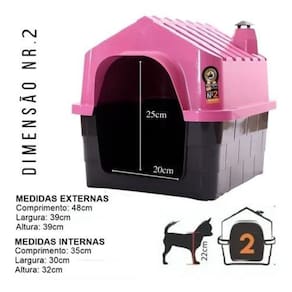 Durahouse n2 - rosa Casinha durahouse numero 2 A casinhafoi especialmente projetada pensando no bem estar do animal, um produto totalmente injetado, desenvolvido com plástico 100% reciclado, além de tudo ela possui maior resistência, qualidade e durabilidade. Ela possui chaminé para entrada e saída de ar, eliminando possíveis odores, o telhado tem tratamento uv que protege o pet de raios ultravioletas. Varanda estendida com base reforçada Fácil de montar e desmontar com seu sistema de fechamento de encaixe, o easy-click, que também facilita no momento da higienização do produto. Medidas totais Atura 39 cm Largura 39 cm Comprimento 48 cm Raças recomendadas ate 7 kg Maltes Pug Pincher Ilhasa apso Shitzu York shire