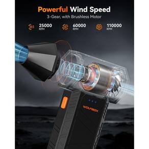 - Ventilador turbo potente: o espanador de ar elétrico WOLFBOX MegaFlow50 atinge velocidades de até 110.000 RPM, removendo efetivamente poeira e detritos. Possui três configurações de velocidade ajustáveis para atender a diferentes tarefas de limpeza.