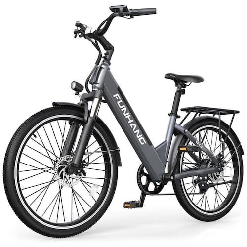 A e-bike Funhang EB-C2 oferece motor 500W (pico 1000W), bateria removível de 48V, 5 modos de pilotagem, suspensão dianteira, bagageiro, freios a disco e quadro step-through. Ideal para adultos de até 136 kg.