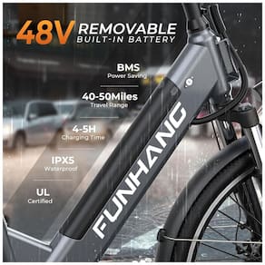 BATERIA INTERNA REMOVÍVEL DE GRANDE CAPACIDADE: As bicicletas elétricas Funhang de 26" para adultos são alimentadas por uma bateria interna removível de 48 V e 374,4 Wh, com certificação UL, proteção BMS, proteção IPX5 à prova d'água e antirroubo. Os ciclistas podem percorrer uma autonomia de 40 a 48 km no modo acelerador e de 64 a 80 km no modo pedal assistido, dependendo do peso, das condições da estrada e do estilo de pilotagem. O design removível garante máxima conveniência, permitindo que você carregue sem esforço em casa ou no escritório.
