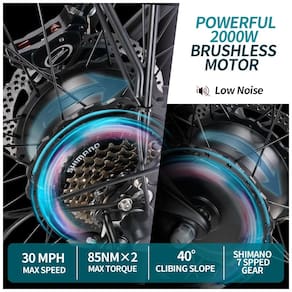 1. Bicicleta elétrica com motor duplo de 2000 W para adultos. Motores duplos sem escovas de 1000 W impulsionam esta e-bike de alta velocidade a 50 km/h. Alterne entre os modos de motor duplo/único para controle de velocidade ou maior alcance.
