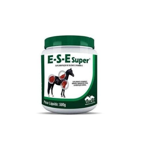 E-S-E Super Pó - 500 grVitamina E e Selênio para animais atletasE-S-E Super Pó é uma suplementação de Vitamina E e Selênio para equinos, muares, asininos, ovinos, caprinos, avestruzes e suínos em estado nutricional inadequado. NÍVEIS DE GARANTIA POR KG DO PRODUTO Vitamina E (mín.)........125.000 mgL-Lisina (mín.)....................100 gSelênio (mín.)...................150 mg MODO DE USAR Para ser usado por via oral. Equinos, Muares, Asininos: 20 g ou 20 mL por dia;Potros, Pôneis: 10 g ou 10 mL por dia;Ovinos, Caprinos e Avestruzes adultos: 10 g ou 10 mL por dia;Cordeiros, Cabritos e Avestruzes filhotes: 2 g ou 2 mL por dia;Suínos adultos: 7,5 g ou 7,5 mL por dia;Leitões: 3 g ou 3 mL por dia.Produto registrado no Ministério da Agricultura, Pecuária e Abastecimento sob o nr. SP-05452 00005