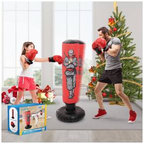 O conjunto acompanha par de luvas em couro sintético PU em tamanho infantil, dimensionadas para mãos de crianças. A base deve ser preenchida com água ou areia e a parte superior inflada com bomba de ar, permitindo uso em ambientes internos ou externos planos para atividades físicas, exercícios de coordenação e brincadeiras ativas.?
