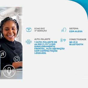 Assistente Virtual Alexa integrada Controle por voz e movimento Função de alarme Design compacto e elegante Áudio de alta qualidade Compatível com diversos dispositivos inteligentes