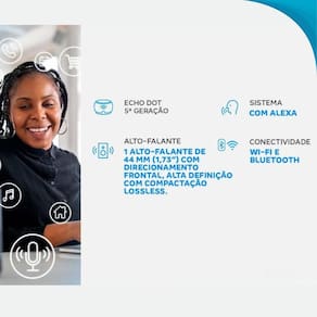 Modelo: Echo Dot Assistente Virtual: Alexa Conectividade: Wi-Fi, Bluetooth Alimentação: Bivolt 110v/220v Dimensões: 43 mm x 99 mm x 99 mm Peso: 300 g