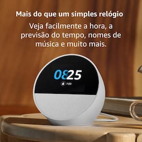 CONHEÇA O NOVO ECHO SPOT Um despertador inteligente com som vibrante e Alexa. Sempre pronto para te ajudar a acordar, relaxar e muito mais. DESPERTADOR INTELIGENTE PERSONALIZÁVEL Veja facilmente a hora, a previsão do tempo e nomes de música, controle dispositivos de casa inteligente e muito mais. Personalize o display com seu design preferido de relógio e cores divertidas. SOM POTENTE E VIBRANTE Curta sons com vocais nítidos e graves profundos. É só pedir para Alexa reproduzir música, podcasts e audiolivros. Veja o título do que está tocando e controle sua música também por toque. SUA VIDA MAIS FÁCIL Crie uma rotina de Alexa para acordar aos poucos ao som de música e com iluminação gradual. Veja rapidamente a hora, confira os lembretes ou peça para Alexa dizer a previsão do tempo. SUA CASA MAIS CONFORTÁVEL Controle dispositivos de casa inteligente compatíveis. É só pedir para Alexa ou tocar no display para ligar ou desligar luzes inteligentes. Crie rotinas para desligar o ar-condicionado quando você sair de casa ou acender as luzes ao pôr do sol. DESENVOLVIDO PARA PROTEGER A SUA PRIVACIDADE A Amazon não vende informações pessoais de clientes. O Echo Spot foi construído com várias camadas de controles de privacidade, incluindo o botão de desligar o microfone e controles no aplicativo. DESENVOLVIDO PARA SUSTENTABILIDADE Esse dispositivo foi feito com 36% de materiais reciclados. É importante que você saiba: Este dispositivo Echo precisa estar conectado ao wi-fi e a uma tomada para funcionar (cabo e fonte de energia inclusos na caixa). Este dispositivo não é compatível com recursos que exigem câmeras integradas, como chamadas de vídeo ou reprodução de câmeras inteligentes. Também não é compatível com streaming de vídeo, como Netflix, Prime Video ou Youtube. Compatível com chamadas de voz entre dispositivos Alexa Especificações - Conectividade Wi-Fi: Wi-fi de banda dupla (5) compatível com redes wi-fi a/b/g/n/ac. - Conectividade Bluetooth: Oferece suporte ao Perfil de distribuição de áudio avançada (A2DP) para streaming de áudio do seu dispositivo móvel para o Echo Spot ou do Echo Spot para o seu alto-falante Bluetooth. Perfil de controle remoto de áudio/vídeo (AVRCP) para controle de voz de dispositivos móveis conectados. O controle por voz no modo de mãos livres não é compatível com dispositivos Mac OS X. Os alto-falantes Bluetooth que exigem códigos PIN não são compatíveis. - Áudio: Speaker integrado de gama completa de 1,73". - Requisitos do sistema: O Echo Spot vem pronto para se conectar à rede wi-fi. O aplicativo Alexa é compatível com dispositivos Fire, Android e iOS. Determinados serviços e Skills podem exigir taxas de inscrição ou outros tipos de taxa. - Tecnologia de configuração: A configuração simples de wi-fi da Amazon permite que clientes conectem dispositivos inteligentes à rede wi-fi em poucas etapas fáceis. - Garantia e assistência técnica: Garantia limitada por 1 ano inclusa. - Inclusos na caixa: Echo Spot, adaptador de tomada (15W) e 12 V (cabo de 1,5m) e Guia de início rápido - Geração: Echo Spot (2024) - Recursos de Privacidade: Tecnologia de palavra de ativação, indicadores de streaming, botão de desligamento do microfone, capacidade de visualizar e excluir suas gravações de voz e muito mais. - Idioma: A Alexa fala português - Display: Tela sensível ao toque de 2,83" com resolução de 320 x 240 pixels. Vidro temperado semicircular - Processador: Amazon AZ2 Neural Edge (MT8519) - Memória: DRAM de 1GB + eMMC de 8 GB