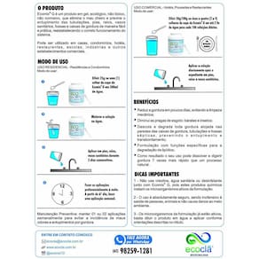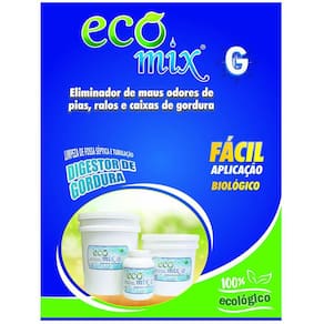 Limpeza prática de fossas, caixas de gordura e prevenção contra entupimentos no encanamento. AÇÃO DO PRODUTODescola e degrada toda gordura alojada nas paredes das caixas de gordura, tubulações e fossas sépticas, reduzindo a incidência de baratas e eliminando o mau cheiro.DEFINIÇÃOProduto biológico em gel, ecológico, não tóxico e não corrosivo. Incompatível com substâncias ácidas ou a base de cloro e soda cáustica. O uso é absolutamente seguro, sendo inofensivo à saúde de pessoas e animais e não causa danos ao meio ambiente.VANTAGENSFácil aplicação e não apresenta nenhum risco à saúde;Diminui o mau cheiro de pias, ralos e vasos sanitários;Reduz a gordura em poucos dias, evitando a limpeza mecânica;Previne o entupimento da tubulação e transbordamento de fossas;Diminui as pragas de esgoto baratas, insetos, etc. ;Garante maior vida útil às fossas;Não causa danos ao meio ambiente. MODO DE USOAplicação: Diluir 01 colher de sopa 25g do produto ECOMIX G em 500 ml de água e aplicar diretamente no local desejado por 05 dias consecutivos.Manutenção Preventiva: manter 01 ou 02 aplicações semanalmente para evitar a incidência de maus odores e entupimentos por gordura.DICAS IMPORTANTES1. Para desentupir o encanamento ou diminuir a gordura da caixa de gordura, fazer as aplicações preferencialmente à noite, quando o fluxo de água é menor, para que os microrganismos tenham um maior tempo de retenção na tubulação e caixa de gordura. Aplicação direta na fossa ou sumidouro pode ser em qualquer horário.2. Não use cloro, água sanitária ou desinfetante junto com ECOMIX G, pois esses produtos matam os microrganismos ativos da formulação. Produtos incompatíveis: soluções a base de cloro e/ou amônia quaternária.3. O uso de ECOMIX G é totalmente seguro, inofensivo à saúde de pessoas e animais e não causa danos ao meio ambiente.Especificações TécnicasMarca: EcomixModelo: GMaterial: Microrganismos inoculados em gelLocal indicado: Pias, ralos, vasos sanitários, mictório, sumidouros, pelo suspiro da fossa, direto na caixa de gorduraUso indicado: Degradar matéria orgânica da caixa de gordura e fossa, desobstruir/desentupir encanamento, descolar a gordura presa na tubulaçãoQuantidade: 01 Unidade de 500 gramasRendimento: Em média 20 aplicações