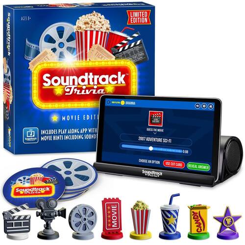 A edição limitada Soundtrack Trivia inclui tudo na edição base mais 8 peças de jogo pintadas à mão atualizadas, um alto-falante Bluetooth com um suporte de dispositivo embutido, bem como 4 porta-copos de dupla face. Soundtrack Trivia é um jogo de tabuleiro que desafia os jogadores a adivinhar o filme com base na música de sua trilha sonora. De filmes clássicos a sucessos de bilheteria modernos, este jogo pode ser apreciado por pessoas de todas as idades, instilando uma sensação de nostalgia do cinema enquanto desfruta de música e tempo com a família e amigos. Teste seus conhecimentos sobre trilhas sonoras de filmes icônicos enquanto ouve clipes e tente identificar os filmes correspondentes. Com uma ampla variedade de gêneros e épocas representados, o Soundtrack Trivia certamente despertará discussões animadas e boas memórias. Se você é um cinéfilo obstinado ou apenas ama uma boa música, este jogo promete horas de entretenimento e competição amigável. Reúna sua equipe apaixonada por filmes, aumente os alto-falantes e prepare-se para embarcar em uma jornada nostálgica pelas melodias mais memoráveis da tela prateada. - Diversão para todas as idades: Trivia sonora é um jogo de festa perfeito para familiares e amigos ou presente para amantes de filmes, oferecendo horas de diversão, emoção e momentos memoráveis que até as crianças vão adorar! - Compatível com a maioria dos dispositivos: Jogue no aplicativo Soundtrack Trivia incluído no seu iPhone, iPad, telefone ou tablet Android ou qualquer navegador de PC. As atualizações do aplicativo são fornecidas para que você não precise comprar um novo jogo para se manter atualizado. - Sinta o toque fresco depois de jogar: inclui um aplicativo complementar com milhares de dicas de uma ampla variedade de títulos de filmes, você sempre será desafiado, garantindo infinitas combinações de curiosidades musicais e reprodução. - Experiência de jogo personalizável: selecione classificações de filmes, gêneros e décadas de perguntas de acordo com sua preferência. Jogue com até 8 jogadores ou use o modo de equipe para jogar com até 8 times. Você também pode praticar usando o modo Lightning exclusivo. - Fácil de reproduzir: basta ouvir uma dica de música de 15 segundos da trilha sonora de um filme, usar suas "Cut Cards" para obter pistas adicionais e adivinhar o filme para avançar no quadro.