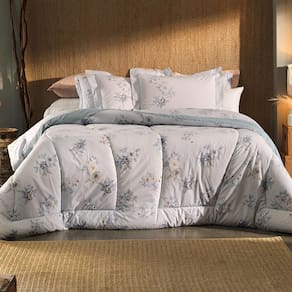 Romântica e delicada, a estampa Amorata combina ramos florais em tons suaves com um fundo azul claro texturizado, criando uma composição leve e encantadora. As flores em nuances de branco, bege e azul acinzentado trazem frescor e sofisticação à decoração, sendo ideais para ambientes que buscam um toque feminino, elegante e atemporal.