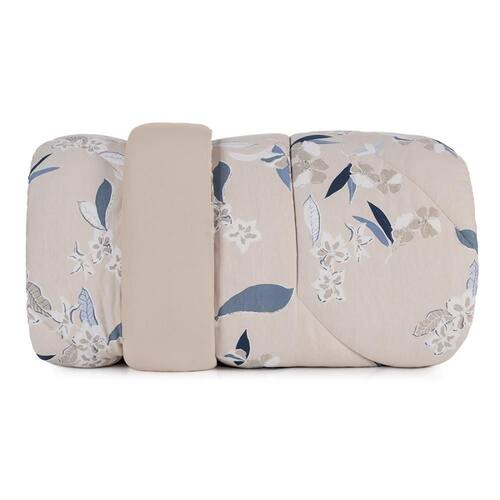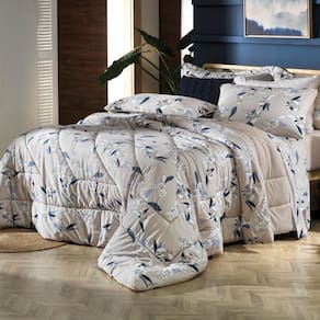 A estampa Kyoto combina a suavidade do bege mocha com flores e folhagens em tons de azul e cinza, criando um visual sofisticado e acolhedor para o quarto. Confeccionada em puro algodão de alta maciez, a coleção oferece edredom com enchimento em poliéster thermobonder leve, colchas com viés e porta-travesseiros no tamanho padrão com abas e acabamento em matelassado quadriculado, que mantém o enchimento bem distribuído e confere um relevo elegante. O jogo de cama completo traz lençol superior com dobra feita, lençol inferior com elástico que se adapta a colchões queen e king de até quarenta centímetros de altura e fronhas estilo envelope com viés e acabamento em rolotê. Já o jogo de cama simples é ideal para o dia a dia, com lençol de elástico e fronhas envelope sem abas. Uma coleção versátil que une conforto, praticidade e beleza em cada detalhe, perfeita para transformar sua cama em um refúgio acolhedor.