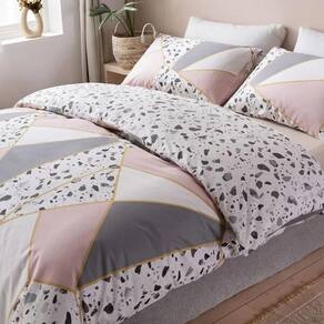 Disponível para camas: CASAL QUEEN 1 edredom dupla face com enchimento 2,60x2,60cm - Frente estampa geométrica mista abstrata, tons De dourado, cinza, branco e rosê - Costas estampa abstrata fundo branco e estampa em cinza. 2 capas de travesseiros de 70cm x 50cm sem enchimento - Frente estampa geométrica mista abstrata, tons De dourado, cinza, branco e rosê - Costas estampa abstrata fundo branco e estampa em cinza.