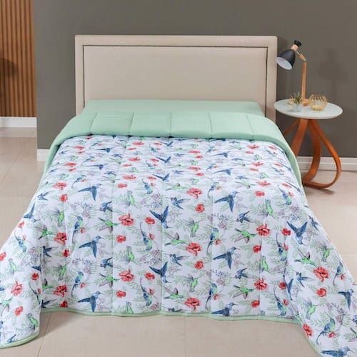 Edredom Cobertor Casa Scarpa Sonnet Solteiro Malha Estampada Dupla Face Algodão - Beija Flor - Verde