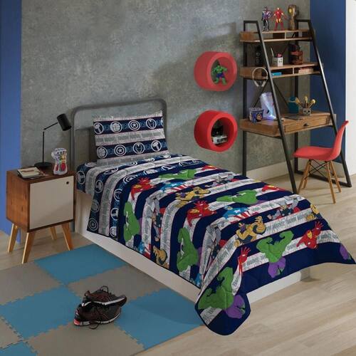 O edredom dos Avengers ilustra os fabulosos heróis que formam essa equipe super poderosa. O tecido em microfibra é muito prático, pois amassa menos, tem ótimo caimento na cama e uma boa durabilidade, além de ser dupla face e conferir a versatilidade de mudar a decoração quando quiser. Com um toque leve e muita maciez, o edredom dos Avengers vem para deixar as noites dos pequenos cheias de conforto e divertidas junto aos seus personagens.