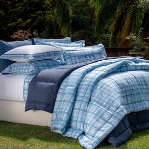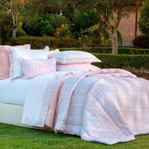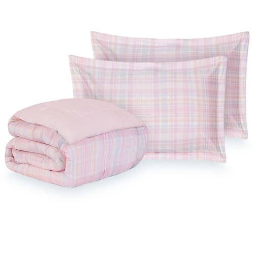 Os Kits Comforter da coleção Percal 200 fios da Naturalle são desenvolvidos do mais puro algodão percal, com fio penteado 40/1 e e enchimento manta siliconada Termobonder 100% poliéster e gramatura de 120g/m, sendo mais leve do que um edredom convencional. Utilizando-se das mais precisas técnicas de acabamento, como antipilling, que evita o aparecimento das indesejáveis bolinhas, mantendo o produto com aparência de novo por muito mais tempo. Introduzimos a Linha Young através de um xadrez ou também chamado tartan, em tons de azul e rosa compondo com jogos de cama liso com detalhe, ideal para vestir quartos despojados, modernos e atemporais. O kit comforter solteiro é composto por edredom matelassê em listras, dupla face, sendo frente estampada e verso liso índigo e fronhas 4 abas com estampa frente e verso estampa Xadrez London e fechamento envelope. Perfeito para compor a cama da garotada! Foto meramente ilustrativa.