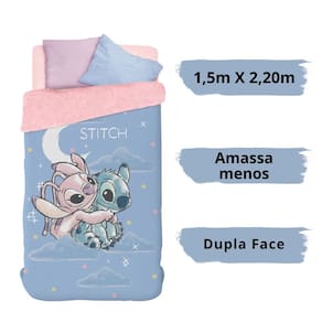 O Edredom Dupla Face com Sherpa da coleção Stitch e Angel da Lepper une conforto, qualidade e diversão em um só produto. De um lado, estampa digital em alta definição dos personagens mais adoráveis da Disney. Do outro, a textura macia da sherpa, que remete à lã de carneiro, garantindo aconchego nas noites mais frias. Feito em microfibra 100% poliéster, o edredom amassa menos, é leve, fácil de lavar e seca rapidamente. Perfeito para o dia a dia.