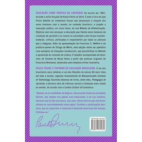 Educação como prática da liberdade foi escrito em 1967, durante o exílio forçado de Paulo Freire no Chile. Tem como principal objetivo alcançar a educação que liberta seres humanos da condição de oprimido e os insere na sociedade como forças transformadoras, críticas, politizadas e responsáveis por todas as pessoas que a integram. Além de apresentação de Francisco C. Weffort e prefácio-poema de Thiago de Mello, esta edição reúne apêndice com exemplos de situações existenciais, que possibilitam no Método a apreensão do conceito de cultura. São acompanhadas de desenhos de Vicente de Abreu feitos a partir das pinturas autênticos de Francisco Brennand, destruídas pela ditadura militar brasileira. Em 1963, em Angicos, interior do Rio Grande do Norte, trezentos trabalhadores rurais foram alfabetizados em apenas 40 horas, pelo método proposto por Paulo Freire. Esse foi o resultado do projeto-piloto do que seria o Programa Nacional de Alfabetização do governo de João Goulart, presidente que viria a ser deposto em março de 1964. Em outubro desse mesmo ano, Freire deixou o Brasil para proteger a própria vida. Apenas voltou a visitar o país em 1979, com a abertura democrática. Ao longo de sua história, Paulo Freire recebeu mais de cem títulos de doutor honoris causa, de diversas universidades nacionais e estrangeiras, além de inúmeros prêmios, como Educação para a Paz, da Unesco, e Ordem do Mérito Cultural, do governo brasileiro. Integra o International Adult and Continuing Education Hall of Fame e o Reading Hall of Fame. “Quando um ex-analfabeto de Angicos, discursando diante do presidente Goulart, que sempre nos apoiou com entusiasmo, e de sua comitiva, declarou que já não era massa, mas povo, disse mais do que uma frase: afirmou-se conscientemente numa opção. Escolheu a participação decisória, que só o povo tem, e renunciou à demissão emocional das massas. Politizou-se.”